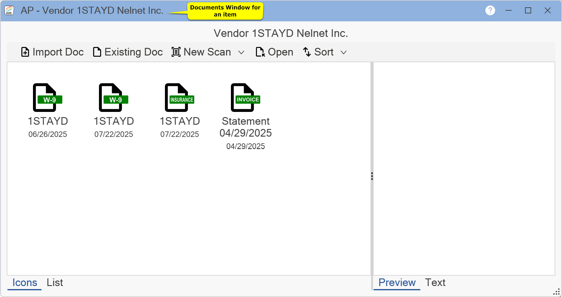 This window lists documents attached to the record from which the window is opened. If opened from a posting, then it will show all documents attached to that transaction. If opened from a maintenance form, then it will show all documents attached to that particular entity, such as a vendor, employee, or equipment. The Documents window is the primary location from which documents are managed. Documents may be added, deleted, and viewed from this window. At the top of the window, the title bar indicates which module the selected record belongs to.