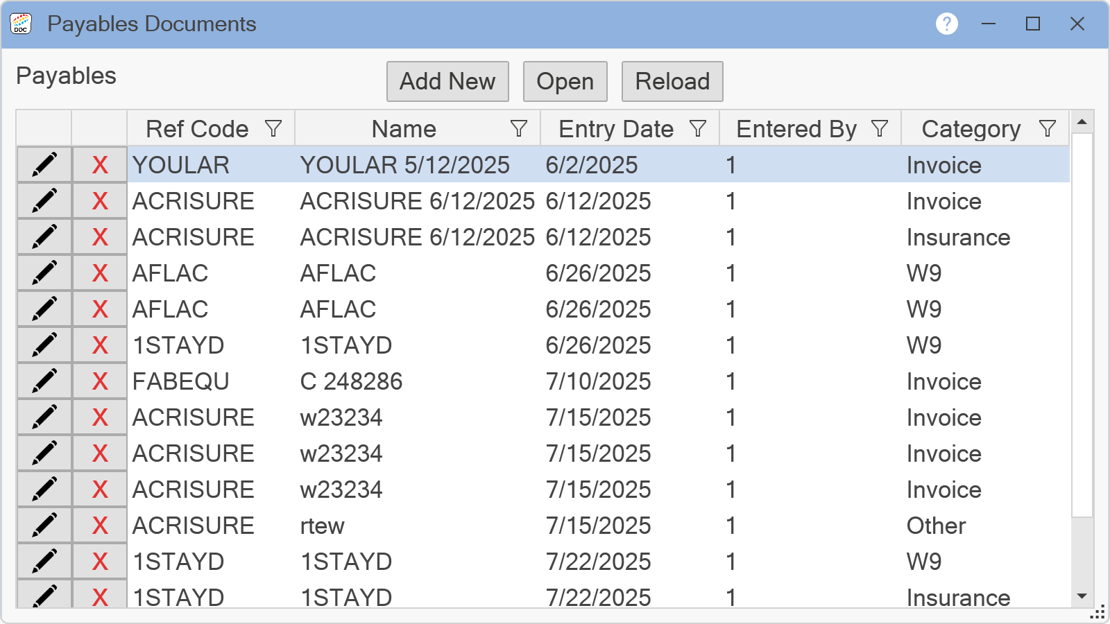 Entering from a module Utilities menu item will take you to the following module Documents window:
