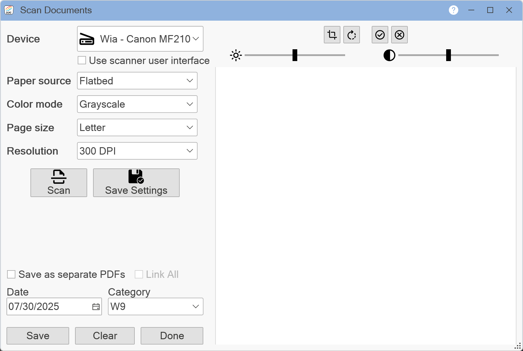 From this Scan Documents window, you may set default scanner settings, scan documents to be added to the Document Manager, and perform some basic editing to scanned documents. Select the Device you wish to use for scanning. Set the Paper Source, Color Mode, Page Size, and Resolution for the scans. If you want to use your scanner's user interface for scanning, check the Use Scanner User Interface box. Click the Save Settings button to save these scan settings as your default settings for the Document Manager. Load your documents into your selected scanner and click the Scan button. A thumbnail of each scanned image will appear in the list on the window. To view an image, click on the thumbnail of the image you want to see. It will appear in the box on the right. You may adjust the brightness and contrast of the image, rotate the image, and crop the image. Click the