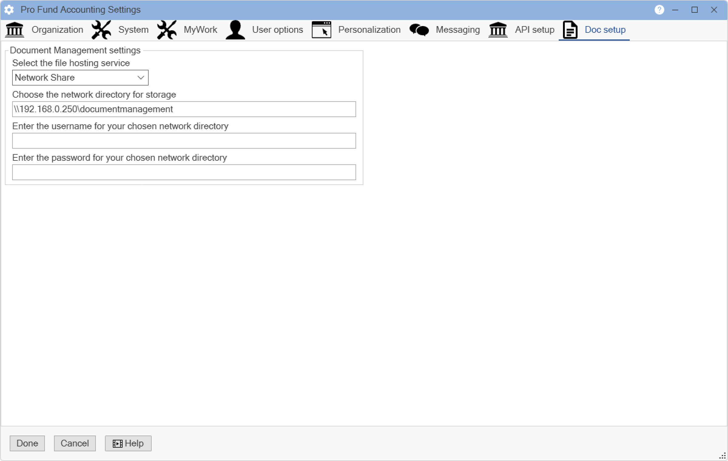 button at the bottom left corner of the main window. Click on the Doc Setup Tab. Select whether documents will be stored on the local machine or on a network share by using the drop down list in the Select the file hosting service field. Enter the path to the folder that will hold the documents by clicking on the Folder button at the end of the Choose the network directory for storage field. If saving to a file share and if required, Enter the Username for your chosen network directory and Enter the password for your chosen network directory to access the network folder.