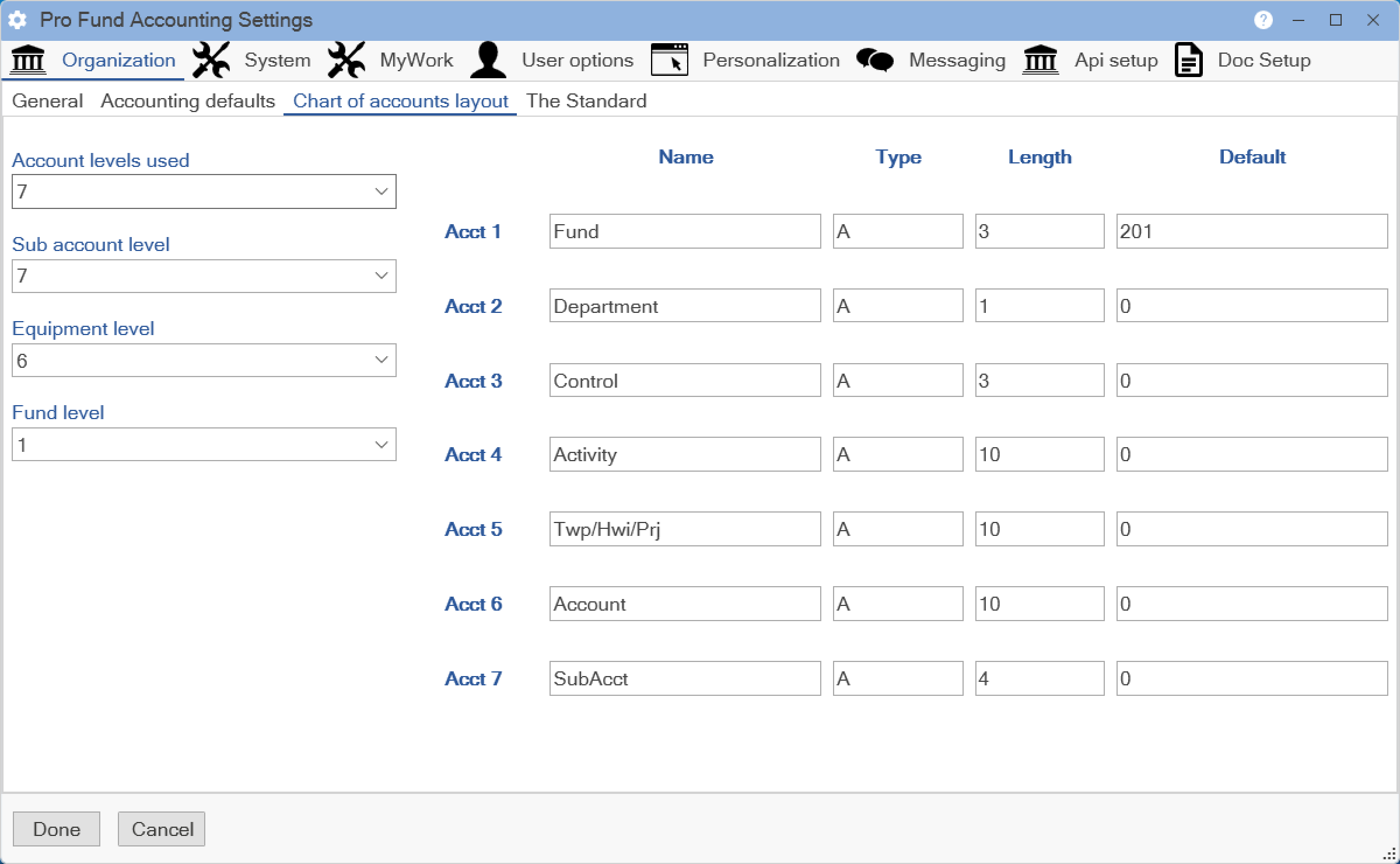 Road Commissions typically have 7 levels for their account structure; Townships typically have 3-5. If you choose the Account levels used to be 4, then only 4 would show on the right-hand side. You would then need to update your Sub account level, Equipment level, and Fund level.
