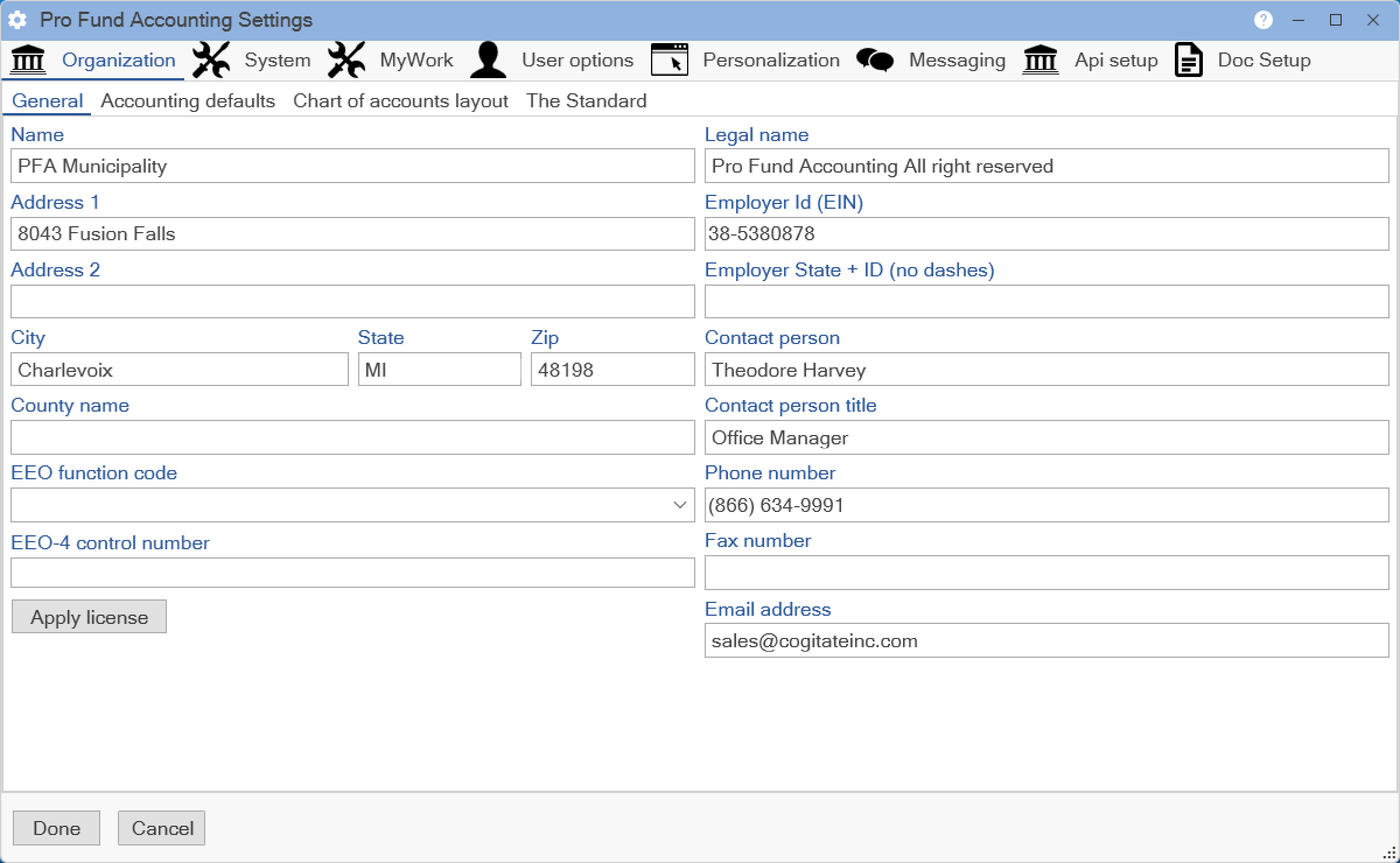 The General Tab is used to enter in the general information about your company, as shown in the above image. Click on the Apply license button to enter in the activation code for Pro Fund Accounting.