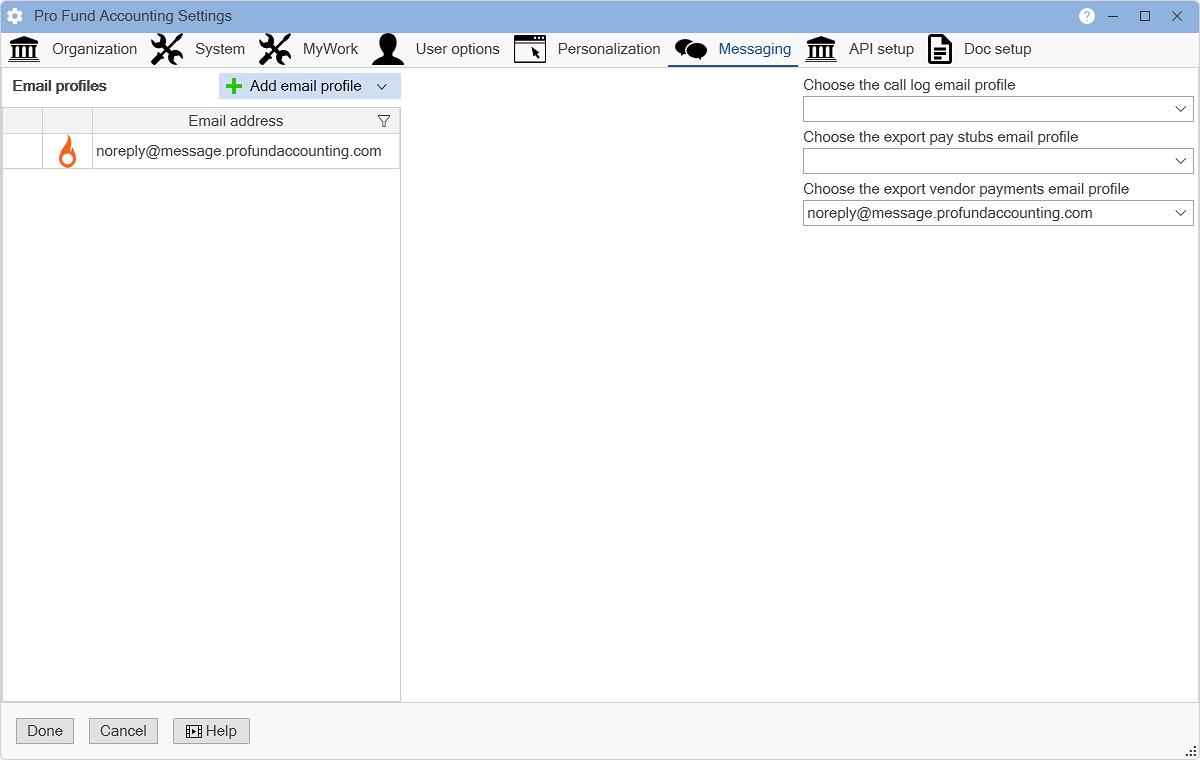 By using the drop down list for each field, choose the email profile to use for the Call Log, the Export Pay Stubs, and the Export Vendor Payments menu items.