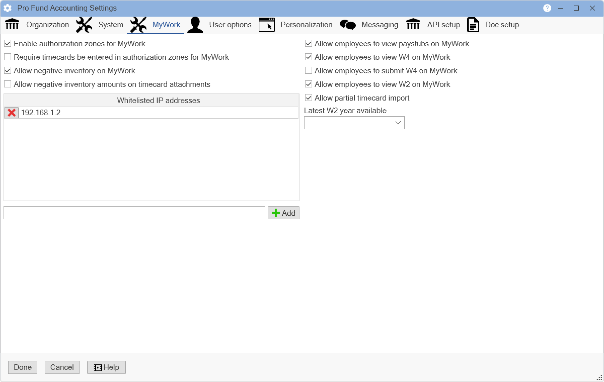 Check the boxes next to all of the options that apply to your company. Whitelisted IP Addresses are the addresses that will be permitted to post anywhere, thus bypassing the geo-fencing in MyWork. To enter in a Whitelisted IP Address, enter the address into the field below the Whitelisted IP Addresses box, then click the Add button. To delete an address, click on the X next to the address to be deleted.