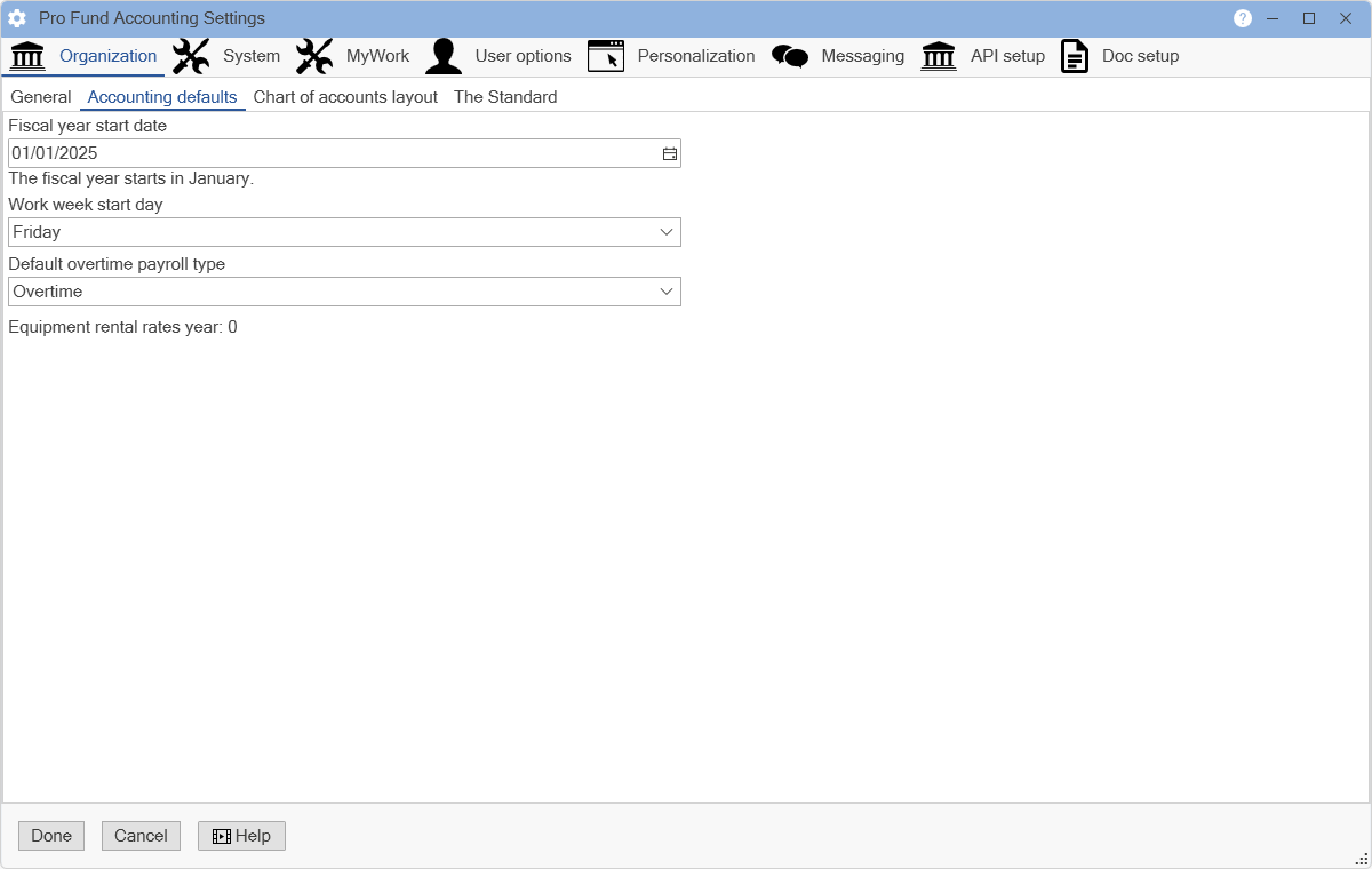 The Accounting defaults Tab is used to set your fiscal year start date and the default overtime payroll type.