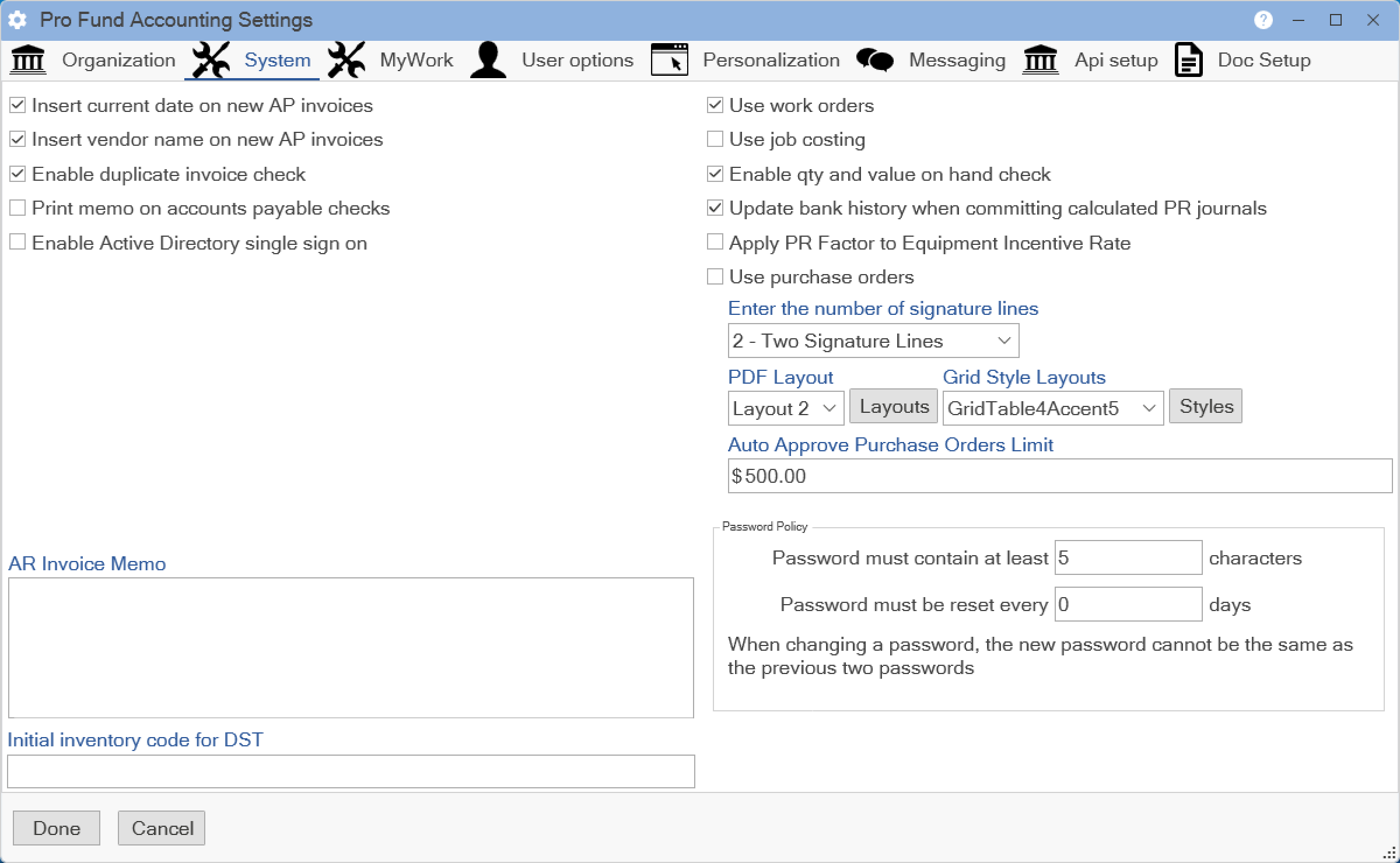 The System Tab allows you to set certain preferences throughout Pro Fund Accounting.